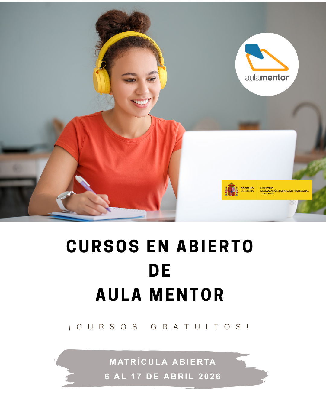 Lanzamos una nueva convocatoria de cursos en abierto (cursos gratuitos) de Aula Mentor, que comenzarán en el mes de abril de 2026.