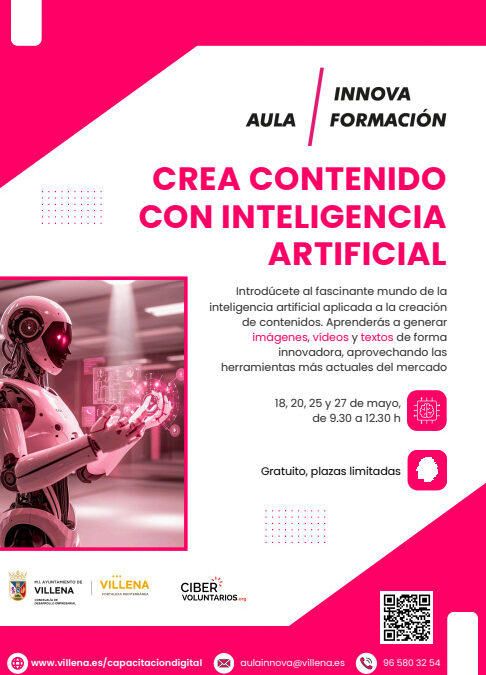 Villena, 24 de abril.-  Aula Innova Formación ofrecerá el curso de 12 horas,  gratuito para todos los públicos ‘Crea contenido con Inteligencia Artificial’. El plazo de solicitud se cierra el próximo 29 de abril, y las solicitudes de inscripción se pueden tramitar desde la web www.villena.es/capacitaciondigital, el email aulainnova@villena.es o en el número de teléfono 96.580.32.54.