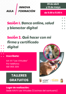 Los días 29 de abri y 13 de mayo, Aula Innova Formación se desplazará hasta la pedanía de Las Virtudes para impartir unos talleres gratuitos dirigidos a personas mayores