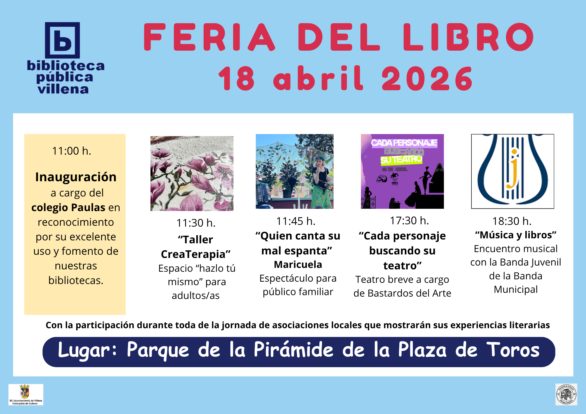 Estas actividades tienen como acto central la celebración de la Feria del Libro, en la Plaza de la Pirámide. Las actividades de esta cita cultural se iniciarán a las 11.00 horas con la inauguración a cargo de los representantes del colegio Las Paulas, centro escolar con mayor índice de participación en el programa de préstamos ‘lotes-aula’, por su excelente uso y fomento de nuestras bibliotecas.