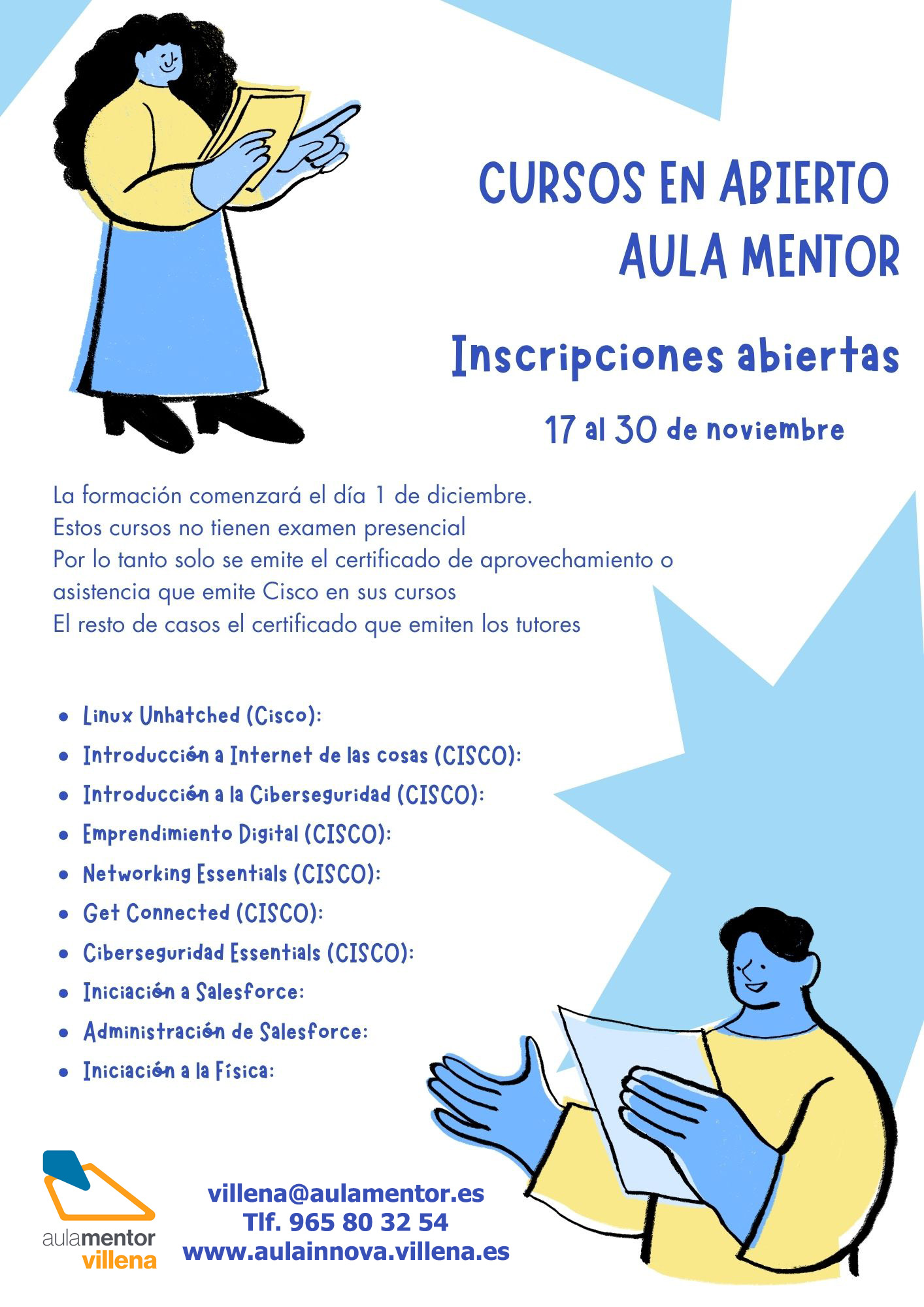 La formación comenzará el día 1 de diciembre y será totalmente online. Estos cursos no tienen examen presencial y por lo tanto solo se emite el certificado de aprovechamiento o asistencia que emite Cisco en el caso de sus cursos o el certificado que emiten los tutores en el caso del resto.