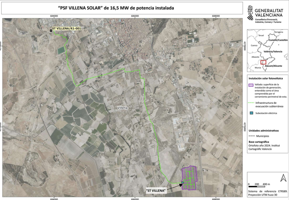 La planta PSF Villena Solar tiene una capacidad de 40,75 MW repartido en varias zonas y requiere de una línea de evacuación de 132kV a lo largo de 5,81 kilómetros que atraviesa la zona de la Huerta de Villena, 3,15 kilómetros por vía aérea y otros 2,66 kilómetros soterrados.