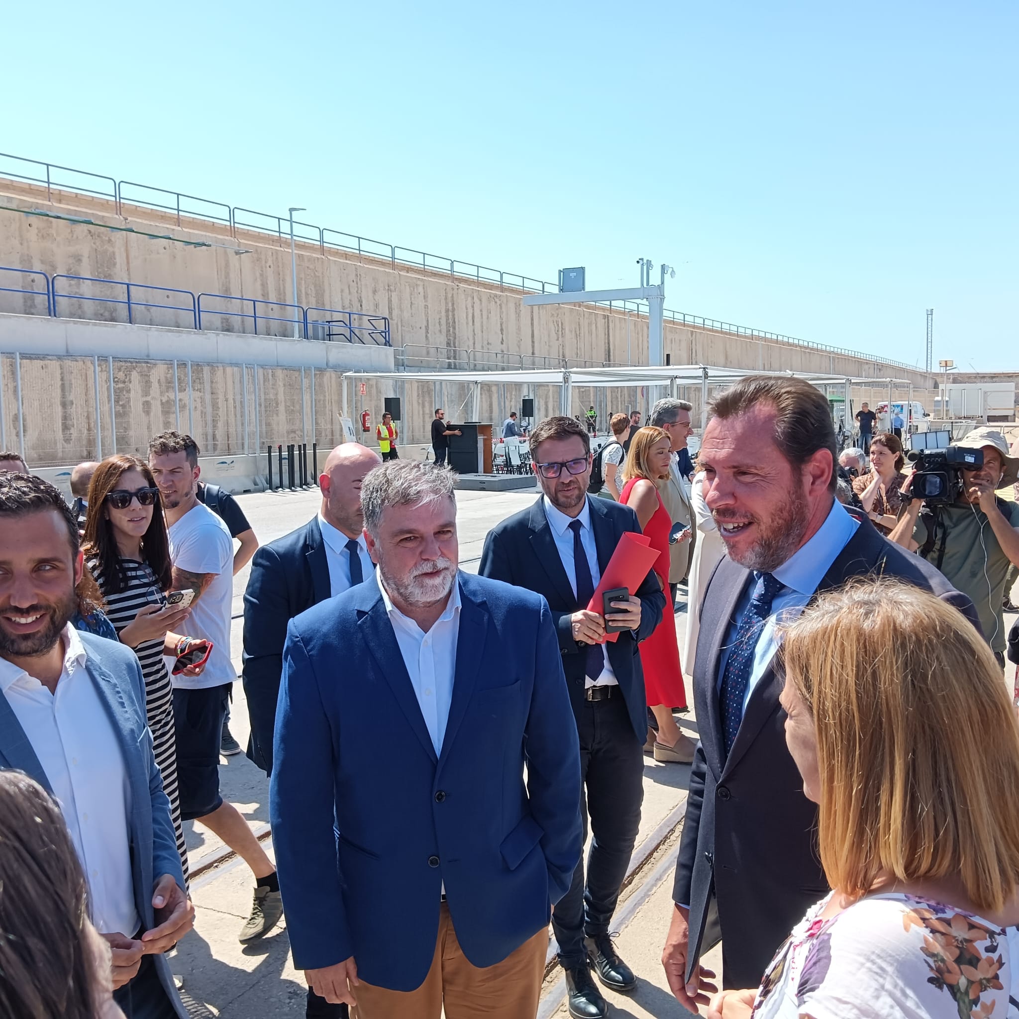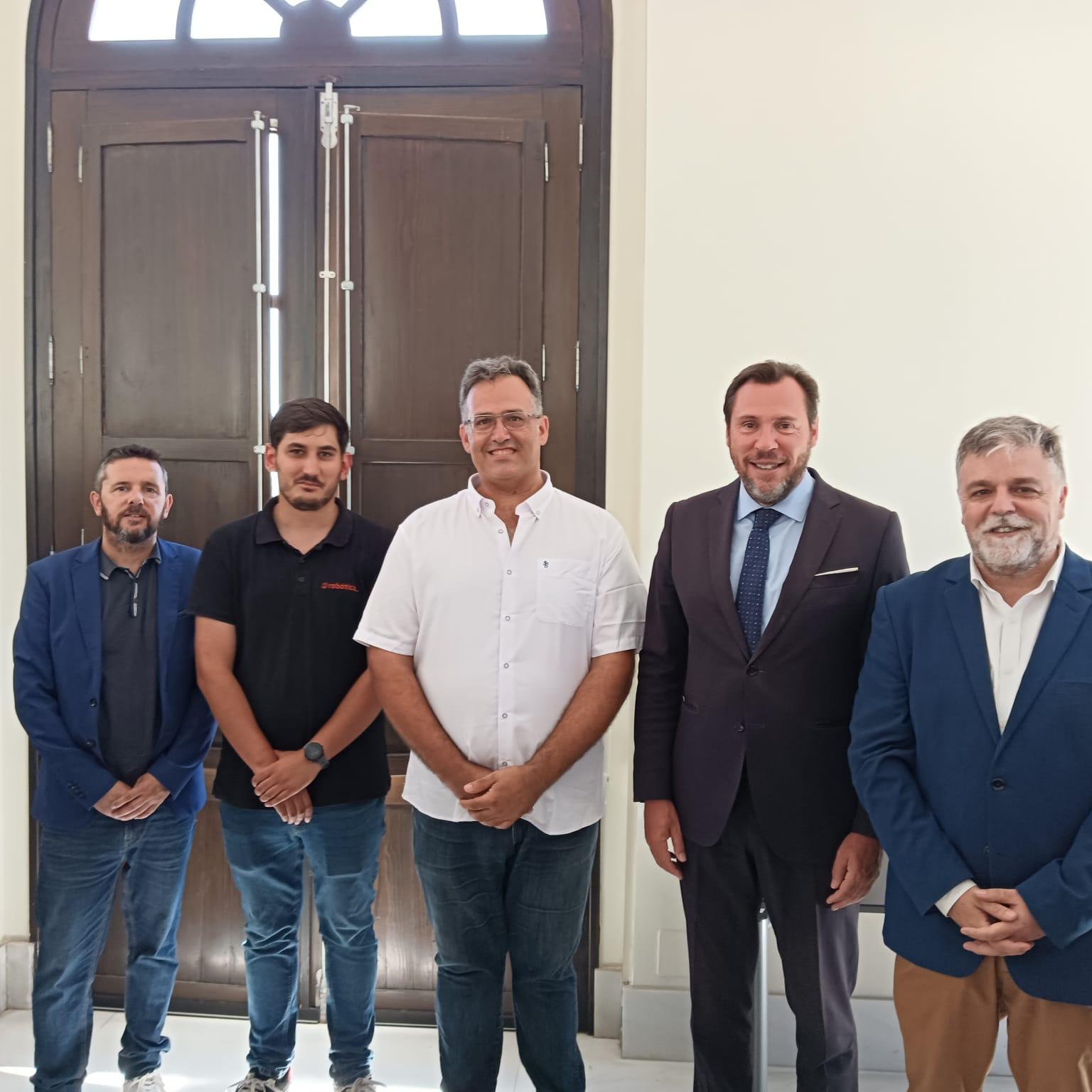Villena, 22 de julio.- El alcalde, Fulgencio Cerdán, y el edil de Urbanismo, Francisco Iniesta, han acudido hoy a la presentación de la autopista marítimo-ferroviaria que se ha implementado en el Puerto de Valencia, cuyo proyecto de automatización ha sido gracias a la participación directa de la empresa de Villena Q Robótica. El acto, que ha estado presidido por el Ministro de Transportes, Óscar Puente, y el presidente de la Generalitat, Carlos Mazón, ha permitido dar a conocer este proyecto a través del cual será posible cargar en cada viaje hasta 40 semiremolques con sus 20 vagones, lo que supone liberar del tráfico rodado por carretera un importante número de camiones y evitar la emisión de CO² y otros gases contaminantes a la atmósfera.