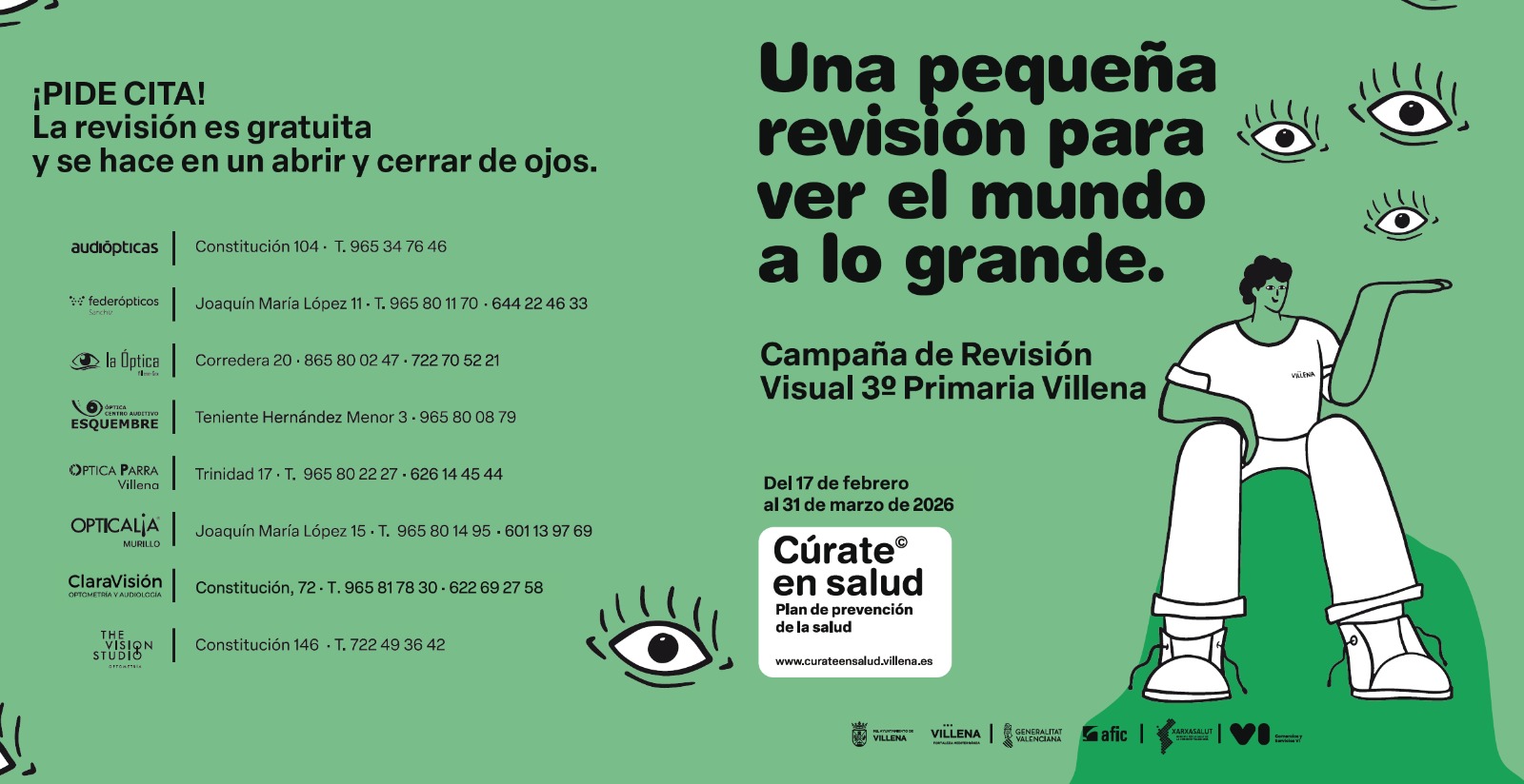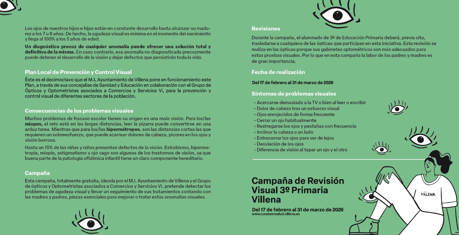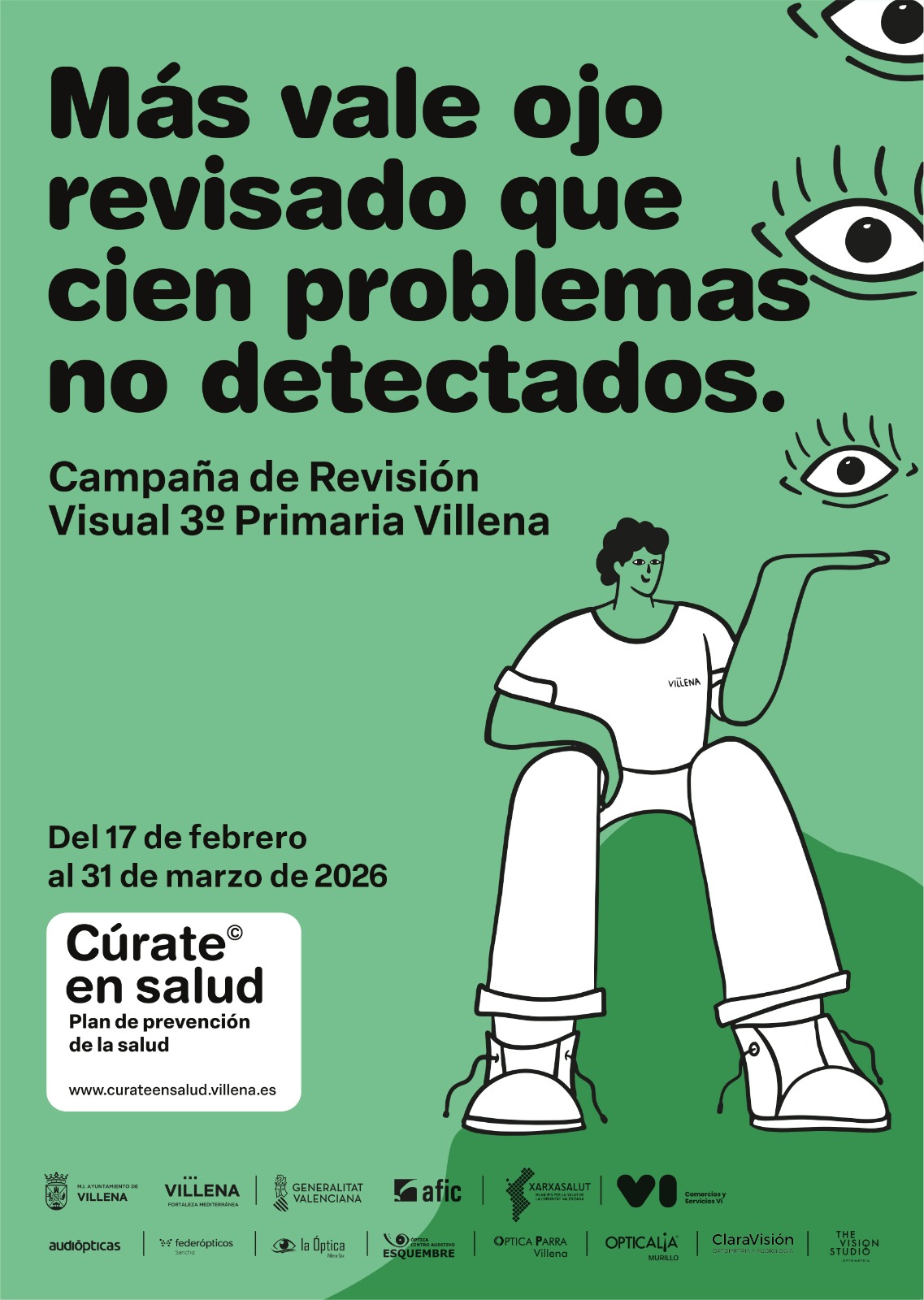 En esta edición colaboran el grupo de ópticos y audiometristas de Villena, que ofrecerán revisiones totalmente gratuitas a los 329 alumnos y alumnas de tercero de Primaria. Además de evaluar el estado del sistema visual de cada niño y niña, la campaña también ofrecerá información sobre su desarrollo visual y posibles necesidades de seguimiento. Las familias han recibido un folleto informativo con todos los detalles para participar. Para acceder a la revisión será necesario solicitar cita previa en las ópticas adheridas antes del 31 de marzo.