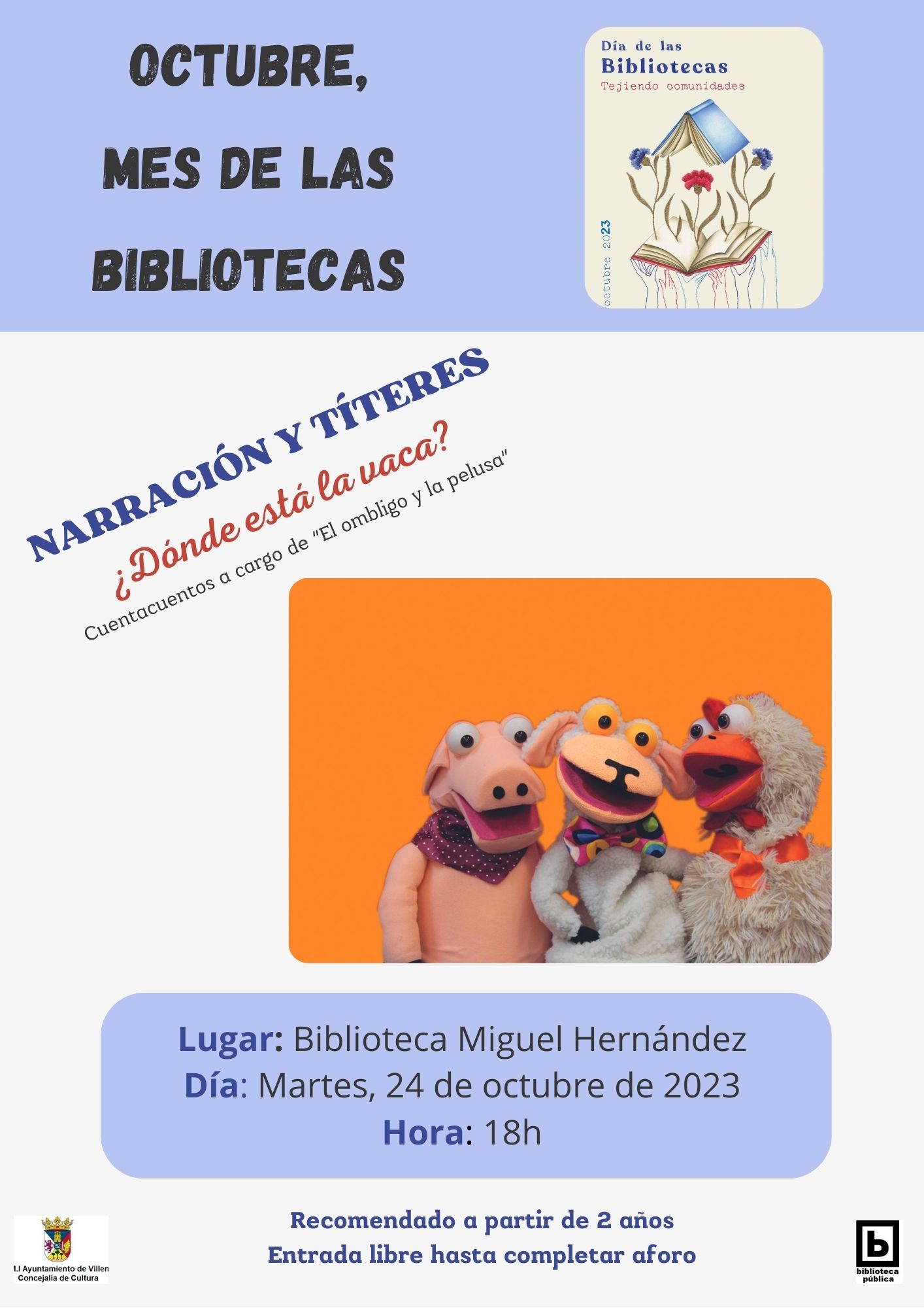Entre las actividades, la Biblioteca Miguel Hernández acogerá mañana martes una nueva sesión de La Hora del Cuento con Títeres, que en esta ocasión ofrecerá el espectáculo ‘¿Dónde está la vaca?’ recomendado para menores a partir de dos años. La entrada es libre y la sesión está prevista a las 18. 00 horas.