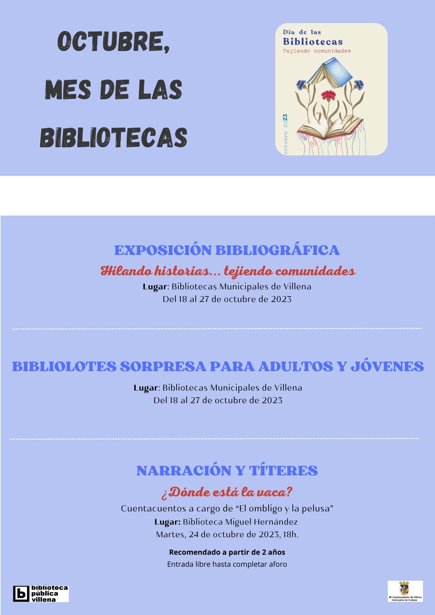 La dirección de las Bibliotecas de Villena, en colaboración con la Dirección General del Libro, del Cómic y de la Lectura celebra el Día de las Bibliotecas bajo el lema Tejiendo Comunidades, que tiene lugar mañana martes en toda España, que contará con una serie de actividades culturales para todos los públicos, según ha informado hoy el responsable, Francisco García.
