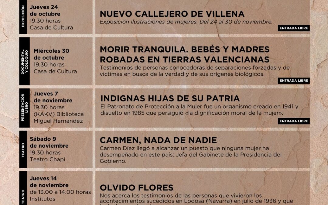 Las jornadas continuarán con el documental y coloquio sobre la tragedia de los bebés robados desde finales de la Guerra Civil: “Morir tranquila. Bebés y madres robadas en tierras valencianas” y con la presentación del libro “Indignas hijas de su patria”, sobre la historia del Patronato de Protección de la Mujer, una institución que ejerció un férreo control sobre las mujeres.
