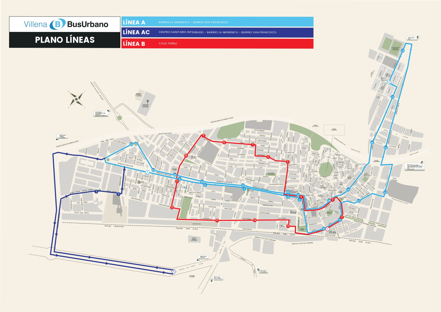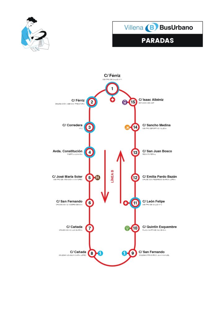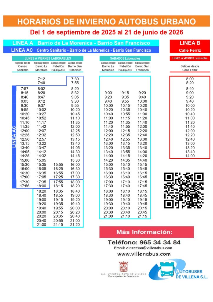 Toda la información sobre horarios, paradas y tarifas está disponible en la web oficial: www.villenabus.com