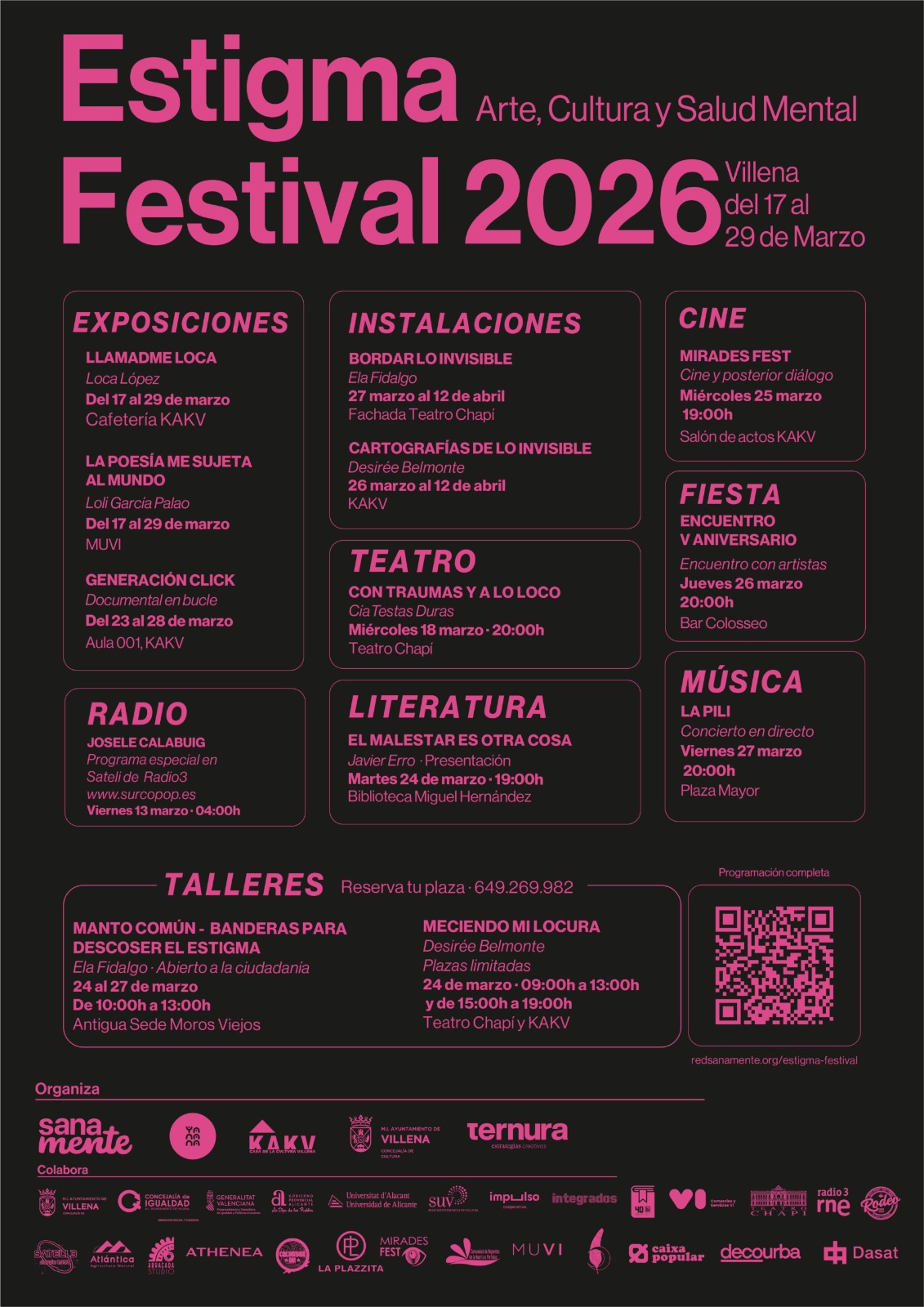 Estigma Festival incluye una amplia propuesta cultural que combina artes visuales, escénicas y espacios de reflexión. En el apartado expositivo destacan ‘Llamadme loca’, de Loca López, que podrá visitarse del 17 al 29 de marzo en la cafetería de la KAKV; ‘La poesía me sujeta al mundo’, de Loli García, del 17 al 29 de marzo en el MUVI; y ‘Generación click’, un documental en bucle que se proyectará del 23 al 28 de marzo en el Aula 001 de la KAKV. A estas propuestas se suman las instalaciones ‘Bordar lo invisible’, de Ela Fidalgo, que se exhibirá en la fachada del Teatro Chapí del 27 de marzo al 12 de abril, y ‘Cartografías de lo invisible’, de Desirée Belmonte, que podrá visitarse en la KAKV del 26 de marzo al 12 de abril.