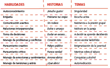 - Contenidos El programa se desarrolla a partir de 10 historias en dibujo animado de 3 minutos de duración cada una, desde las cuales se proponen 20 actividades que abordan las 10 Habilidades para la vida propuestas por la OMS. En las actividades sugeridas las relaciona con temas sensibles para el bienestar adolescente como la resistencia a la presión grupal, acoso escolar, escucha activa, singularidad, conquistas.